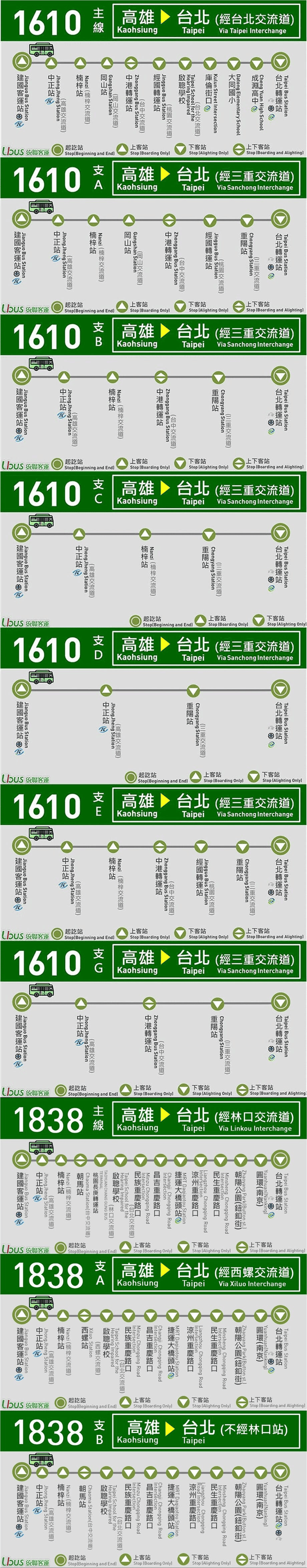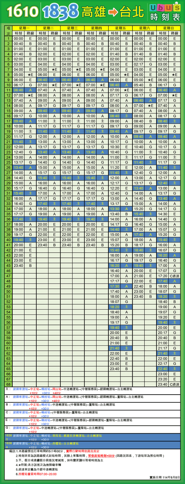 1.配合短端售票實施,本路線再增加販售:「台北-經國轉運站」、「台北-中港轉運站」(無開放國定假日及五六日網路訂票、請至台北轉運站現場購票劃位)、 「岡山-高雄」、「楠梓-高雄」等區間。另本路線配合國道轉乘市區公車優惠:持當日國道票根於台中(中港轉運站)、高雄(高雄車站)轉乘統聯市區公車,可免費搭乘一次。
