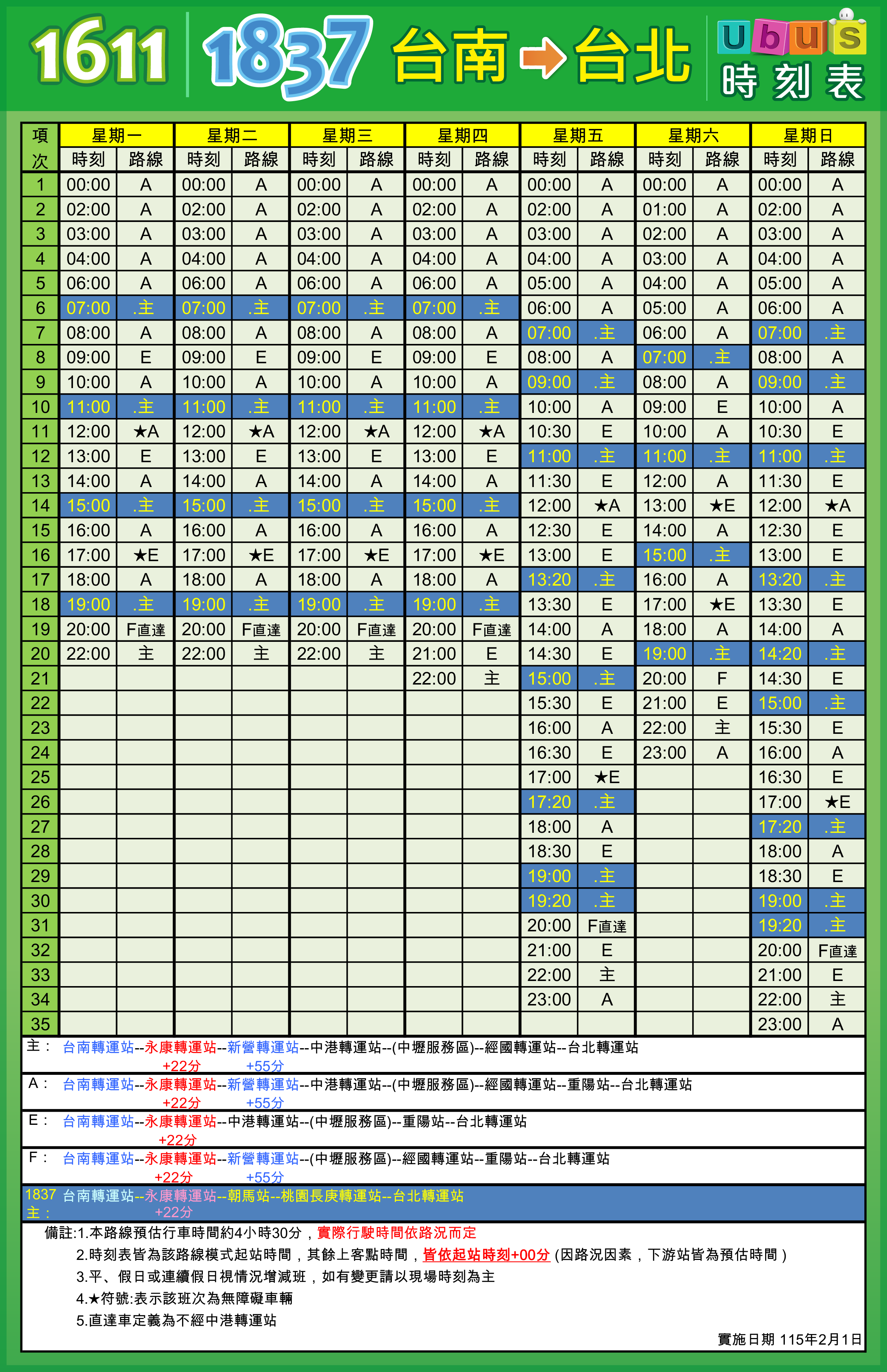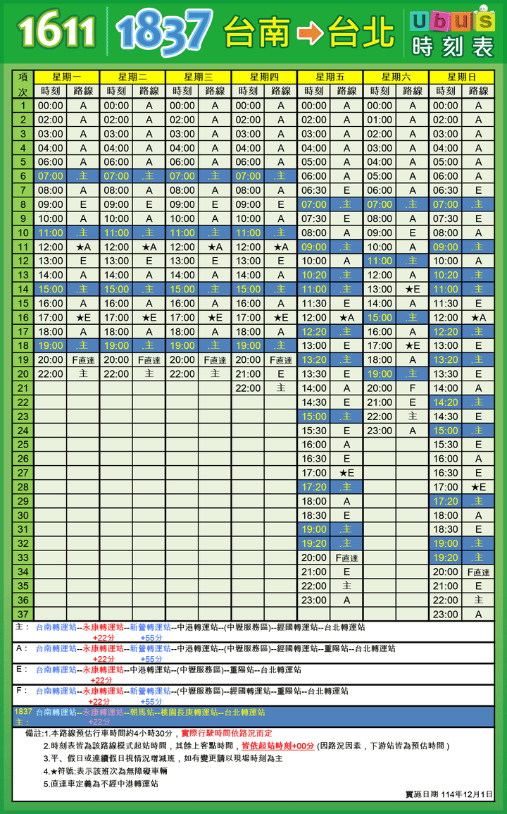| 配合短端售票實施,本路線再增加販售:「經國轉運站-台北」、「台南-中港轉運站」、「台南-新營轉運站」等區間。另本路線配合國道轉乘市區公車優惠:持當日國道票根於台中(中港轉運站)轉乘統聯市區公車,可免費搭乘一次。 ※提醒您:搭乘「台南-中港轉運站」北上時,訂票班次選擇北門站時間19分.鹽行站時間41分.新營轉運站時間14分,則為1612路線。 |