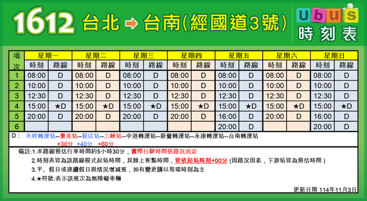 | 配合短端售票實施,本路線再增加販售:「台北-三峽(深夜時段)」、「市府轉運站-中港轉運站」、「中港轉運站-台南」、「新營-台南」等區間。另本路線配合國道轉乘市區公車優惠:持當日國道票根於台中(中港轉運站)轉乘統聯市區公車,可免費搭乘一次。 ※提醒您:搭乘「台南-中港轉運站」北上時,訂票班次選擇北門站時間19分.鹽行站時間41分.新營轉運站時間14分。 |