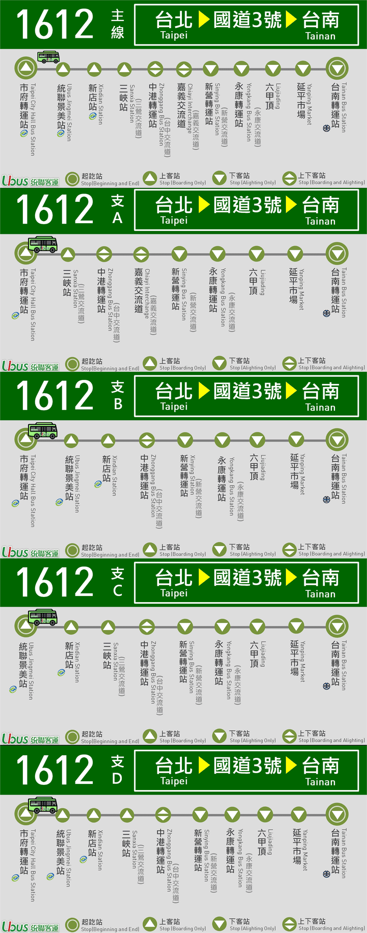 | 市府轉運站 → 統聯景美站 → 新店站 → 三峽站 → 中港轉運站(下客) → 嘉義交流道(下客) → 新營轉運站(下客站) → 永康臨時轉運站(下客) → 六甲頂下客站 → 延平市場下客站 → 台南轉運站(下客站) |