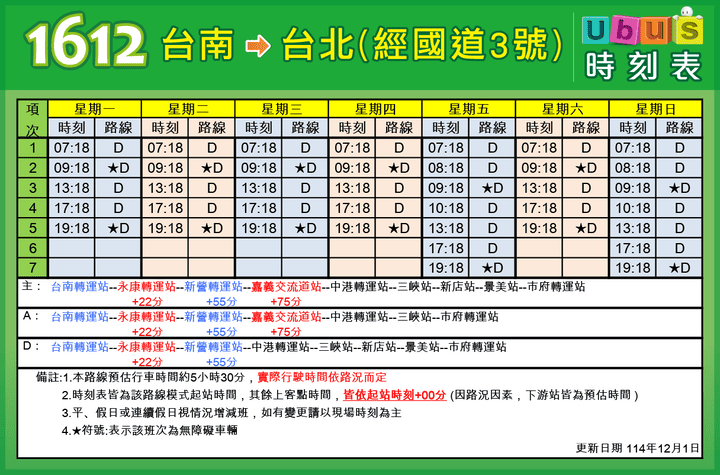 | 配合短端售票實施,本路線再增加販售:「三峽-台北(深夜時段)」、「中港轉運站-市府轉運站」、「台南-中港轉運站」、「台南-新營」等區間。另本路線配合國道轉乘市區公車優惠:持當日國道票根於台中(中港轉運站)轉乘統聯市區公車,可免費搭乘一次。 ※提醒您:搭乘「台南-中港轉運站」北上時,訂票班次選擇北門站時間19分.鹽行站時間41分.新營站時間14分。 |