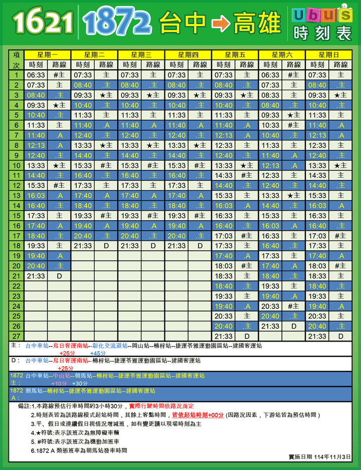 | 配合短端售票實施,本路線再增加販售:「岡山-高雄」區間。107年8月1日起「烏日客運南站-高雄」開放於臨櫃購票、網路訂票及超商購票,無法配合使用台中市敬老愛心卡點數搭乘,詳細說明請參考最新消息。另本路線配合國道轉乘市區公車優惠:持當日國道票根於高雄(高雄車站)轉乘統聯市區公車,可免費搭乘一次。 |