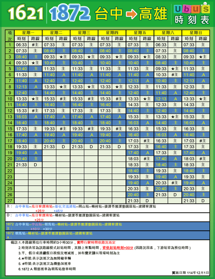 【1621】/【1872】 台中 → 高雄