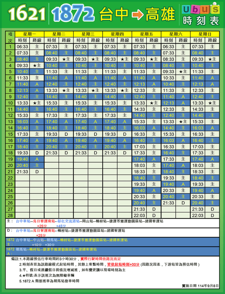 台中車站(大智北路) → 烏日客運南站 → 彰化交流道站 → 岡山下客站 → 楠梓下客站 → 捷運苓雅運動園區站 → 高雄大順三路口下客站 → 建國客運站(下客站) |