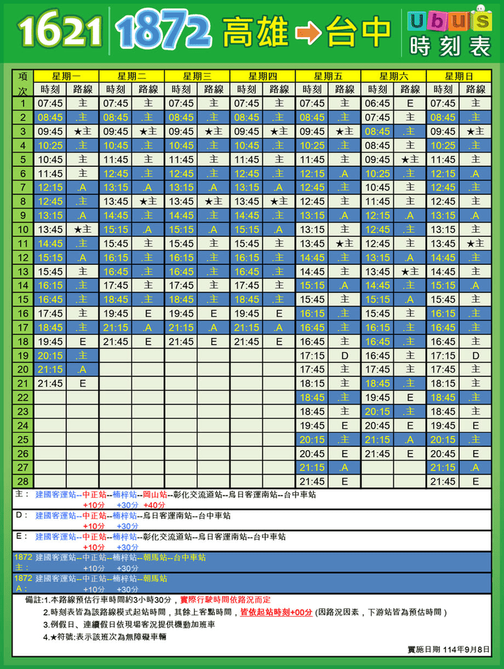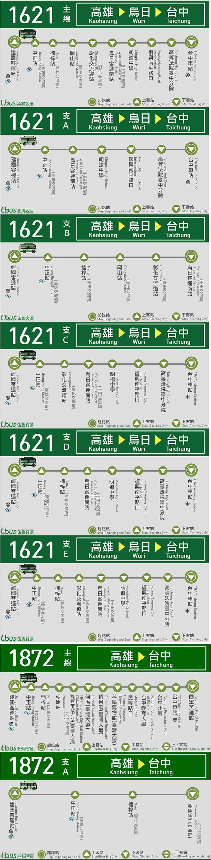 建國站 → 中正站 → 楠梓站 → 岡山站 → 精誠中學(彰化交流道)下客站 → 烏日客運南站(下客站) → 復興南平路口下客站 → 台中車站下客站(大智北路) |