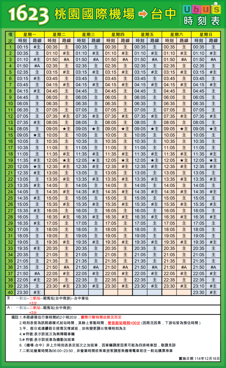 | 另本路線配合國道轉乘市區公車優惠:持當日國道票根於台中(台中商旅、台中車站)轉乘統聯市區公車,可免費搭乘一次。 請注意: 依照汽車運輸業管理規則第73條,每人行李限150立方公寸(換算體積:大約40*50*75立方公分,須將每項物品長寬高三邊相乘計算,參考值大約等同1個32吋行李箱大小32*53*88立方公分) 。長度以車箱能容納不妨礙行車安全及旅客上下為限,超過其限制者,得拒絕承運。為了提供每位乘客乘車及放置行李權益,超額者將加收行李費(半票215或245元),可多利用貨運公司託送行李,快速又便利。 法條參考連結( 汽車運輸業管理規則 ) |