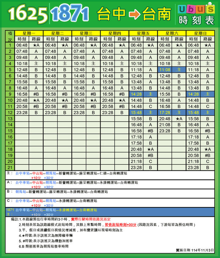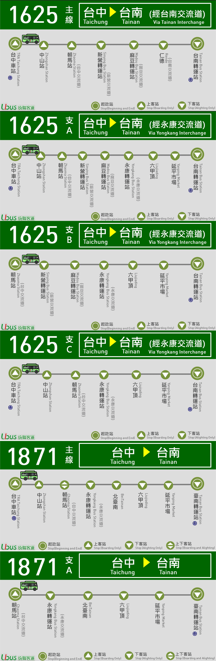 台中車站(大智北路)中山站朝馬站新營轉運站(下客站)麻豆下客站永康臨時轉運站(下客)仁德下客站六甲頂下客站延平市場下客站台南轉運站(下客站)