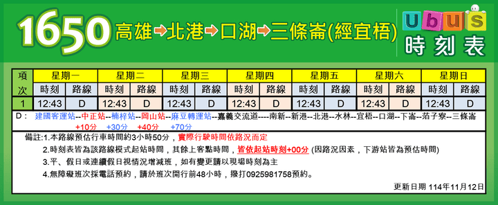 【1650】 高雄 → 北港 → 口湖 → 三條崙(經宜梧)