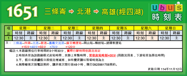 【1651】 三條崙 → 北港 → 高雄 (北港站換車接駁)