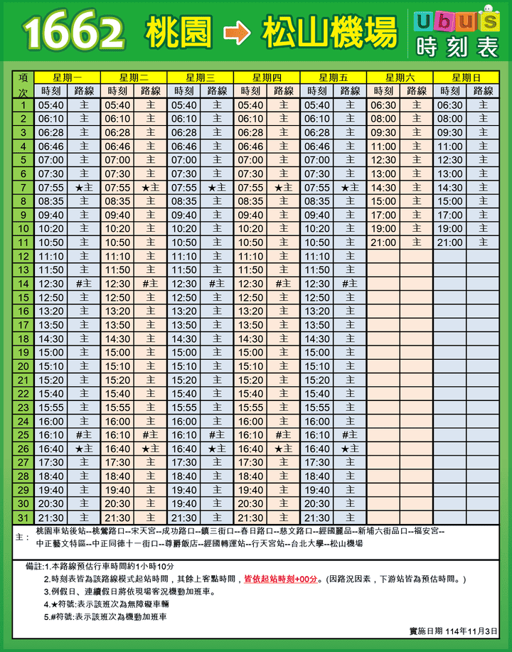 | 桃園車站(後站) → 桃鶯路口 → 宋天宮 → 成功路口 → 鎮三街口 → 春日路口 → 慈文路口 → 經國麗品 → 大興西新埔六街口 → 中正藝文特區 → 中正同德十一街口 → 尊爵飯店 → 經國轉運站(幸福路口) → 高公局(北上) → 馬偕醫院下客處 → 華泰飯店下客處 → 捷運行天宮下客站 → 台北大學(台北校區)下客站 → 松山機場(下客站) |