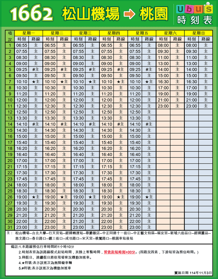 | 松山機場 → 台北大學(台北校區) → 捷運行天宮站 → 華泰飯店 → 馬偕醫院 → 高公局(南下) → 經國轉運站(水汴一路口)下客站 → 尊爵飯店(下客站) → 中正同德十一街口(下客站) → 中正藝文特區(下客站) → 大興西新埔六街口(下客站) → 經國麗品(下客站) → 慈文路口(下客站) → 春日路口(下客站) → 鎮三街口(下客站) → 成功路口(下客站) → 宋天宮(下客站) → 桃鶯路口(下客站) → 桃園車站(後站)下客站 |