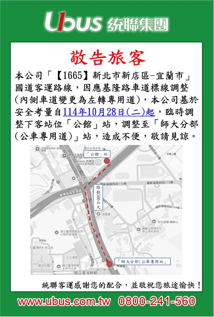 有關本公司【1665】國道客運,114年10月28日起,因應基隆路車道標線調整。