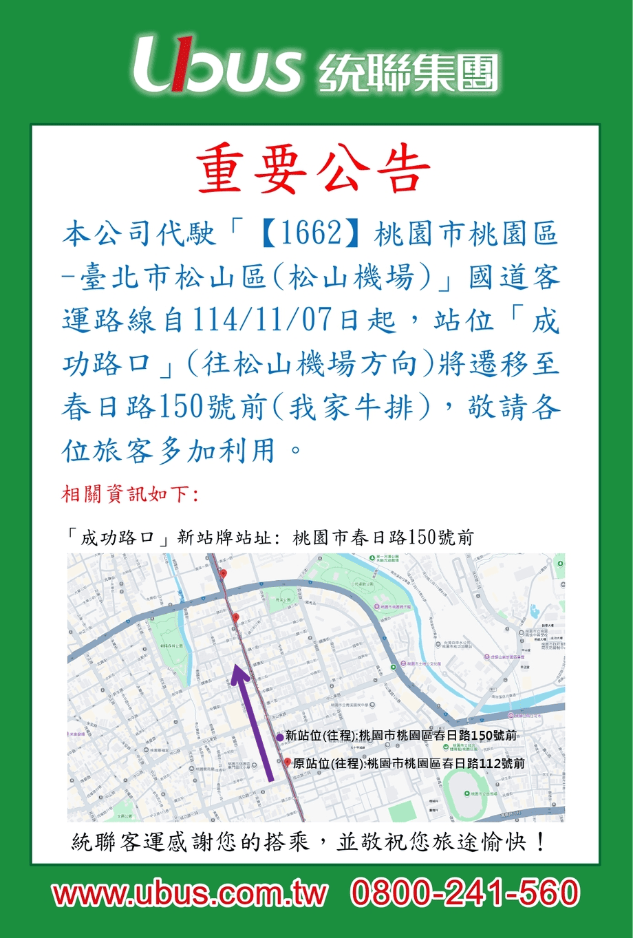 本公司代駛「【1662】桃園市桃園區-松山機場」國道客運路線「成功路口」站位(往松山機場)遷移