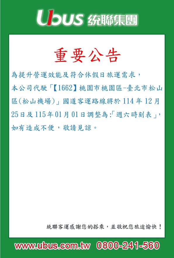 114年12月25日及115年1月1日【1662】桃園-松山機場 調整日型樣態。