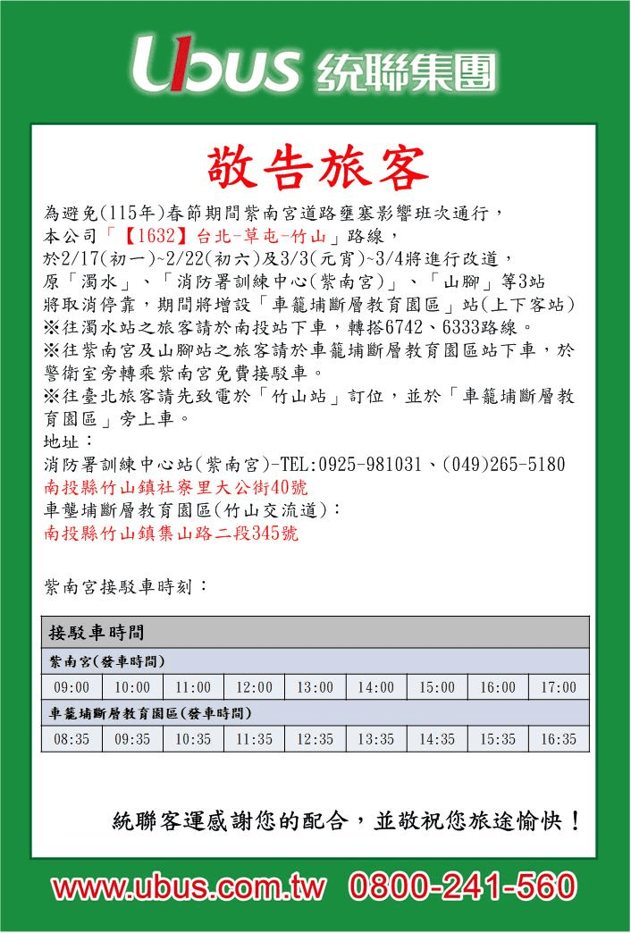 【1632】臺北-草屯-竹山國道客運路線於115年春節期間調整站位