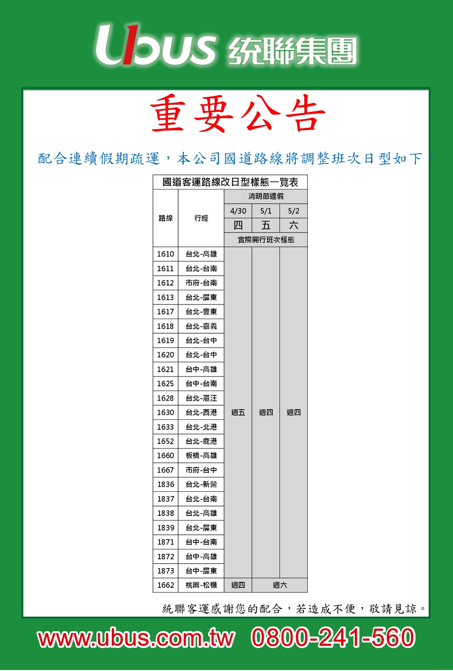 配合連假疏運,本公司【1610】臺北-高雄等24條路線 調整日型樣態一覽表。